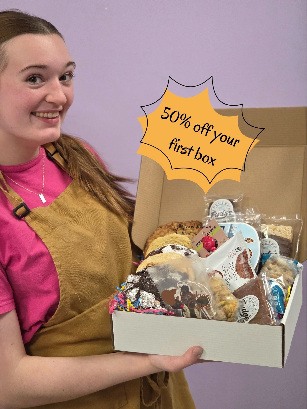 Handcrafted cookies and surprise snacks from our inclusive kitchen, where every box supports meaningful paid work.